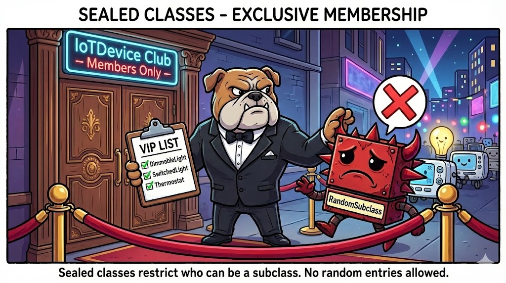public non-sealed class Thermostat extends IoTDevice { } // Open for extension