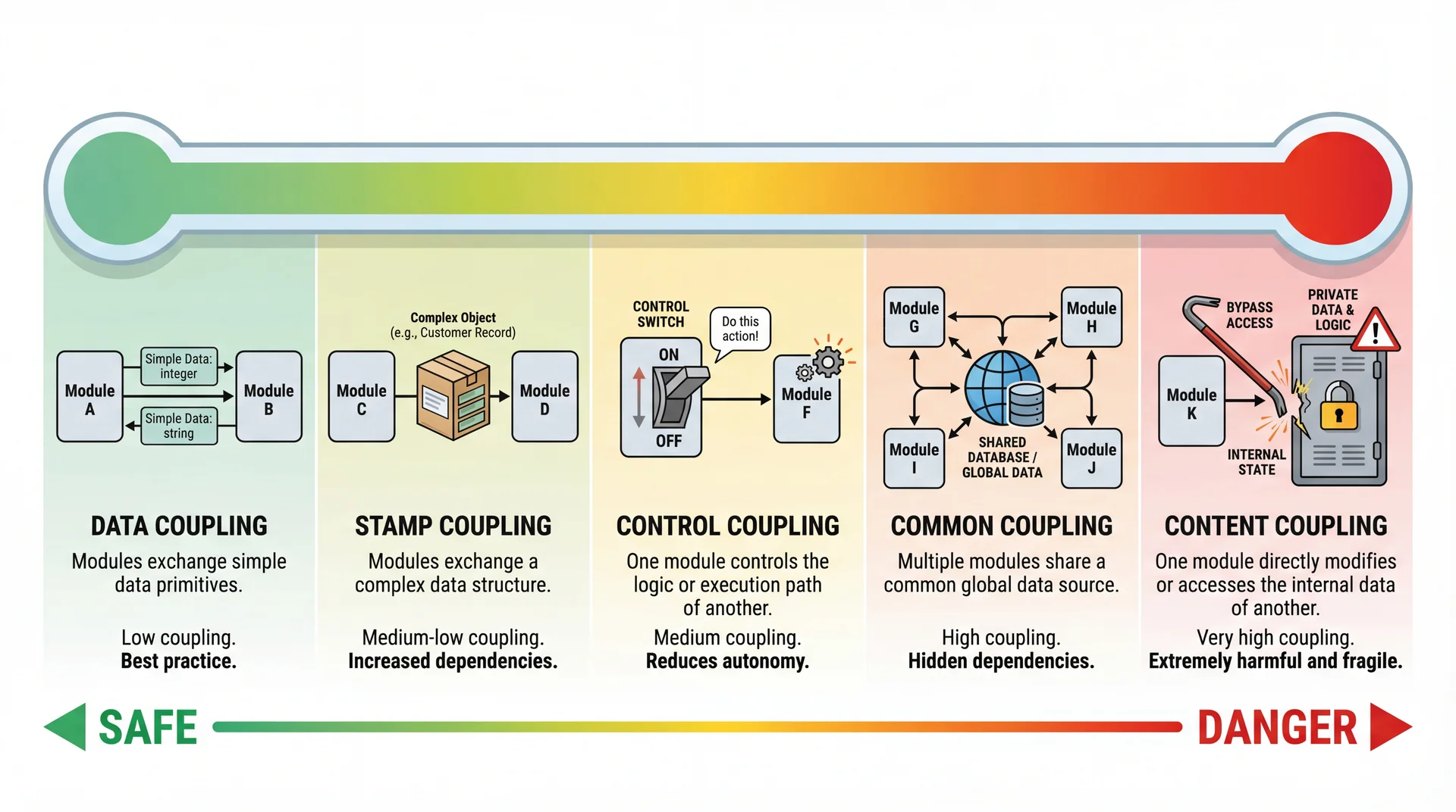 - Prefer data coupling over stamp, control, common, or content