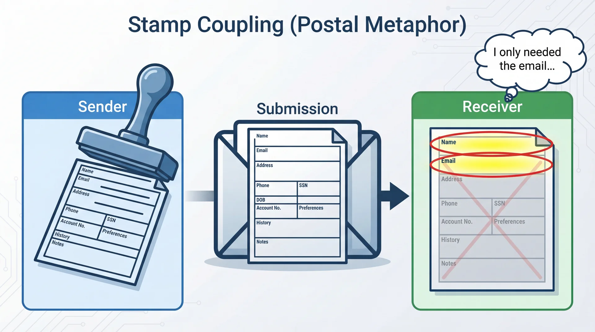 Why "stamp"? Like being coupled to the exact stamp on an envelope with a letter inside—you're coupled to its specific format, which might change.