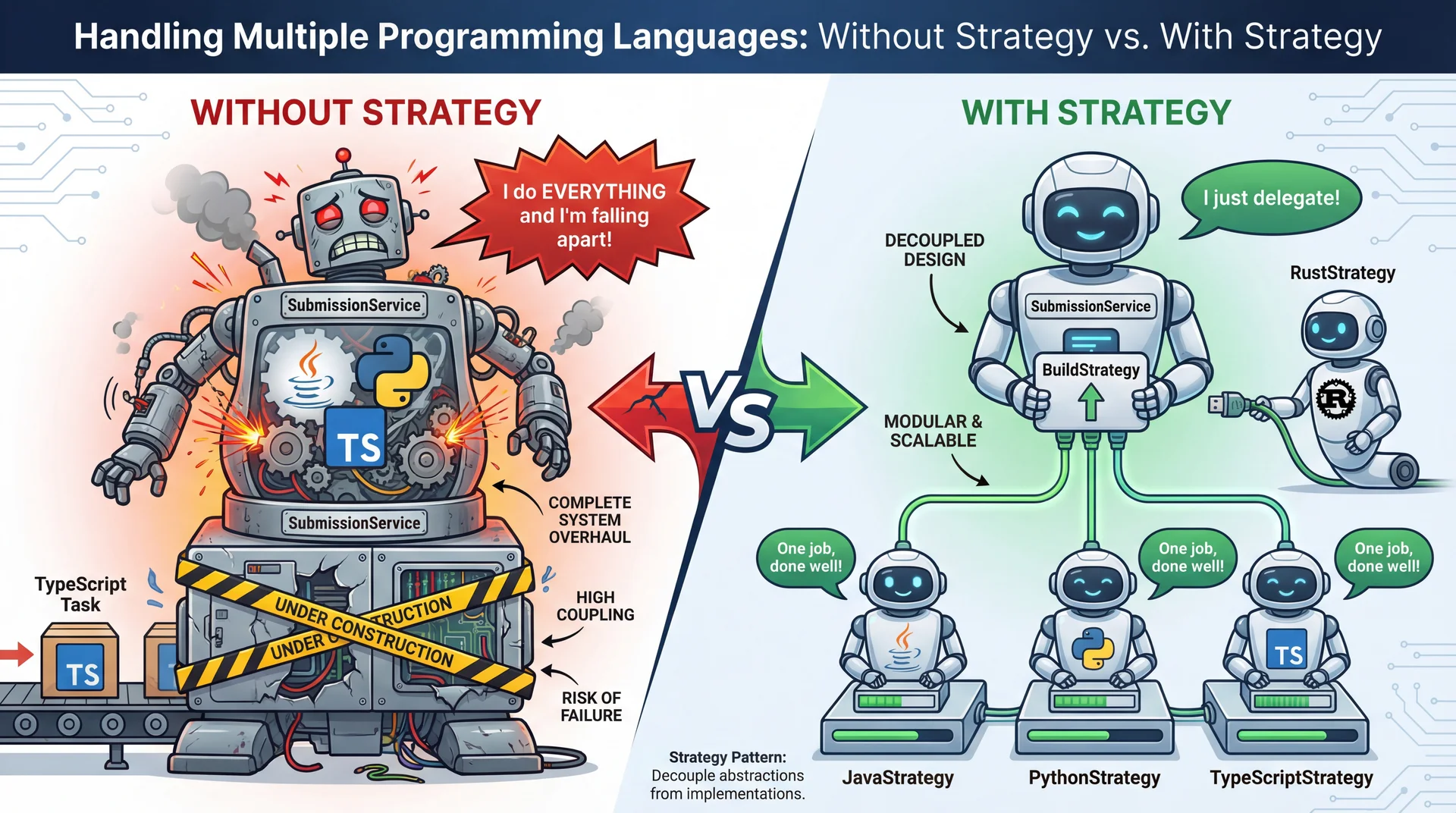 | Coupling | Java/Python code coupled in same class | Each strategy isolated; only interface shared |