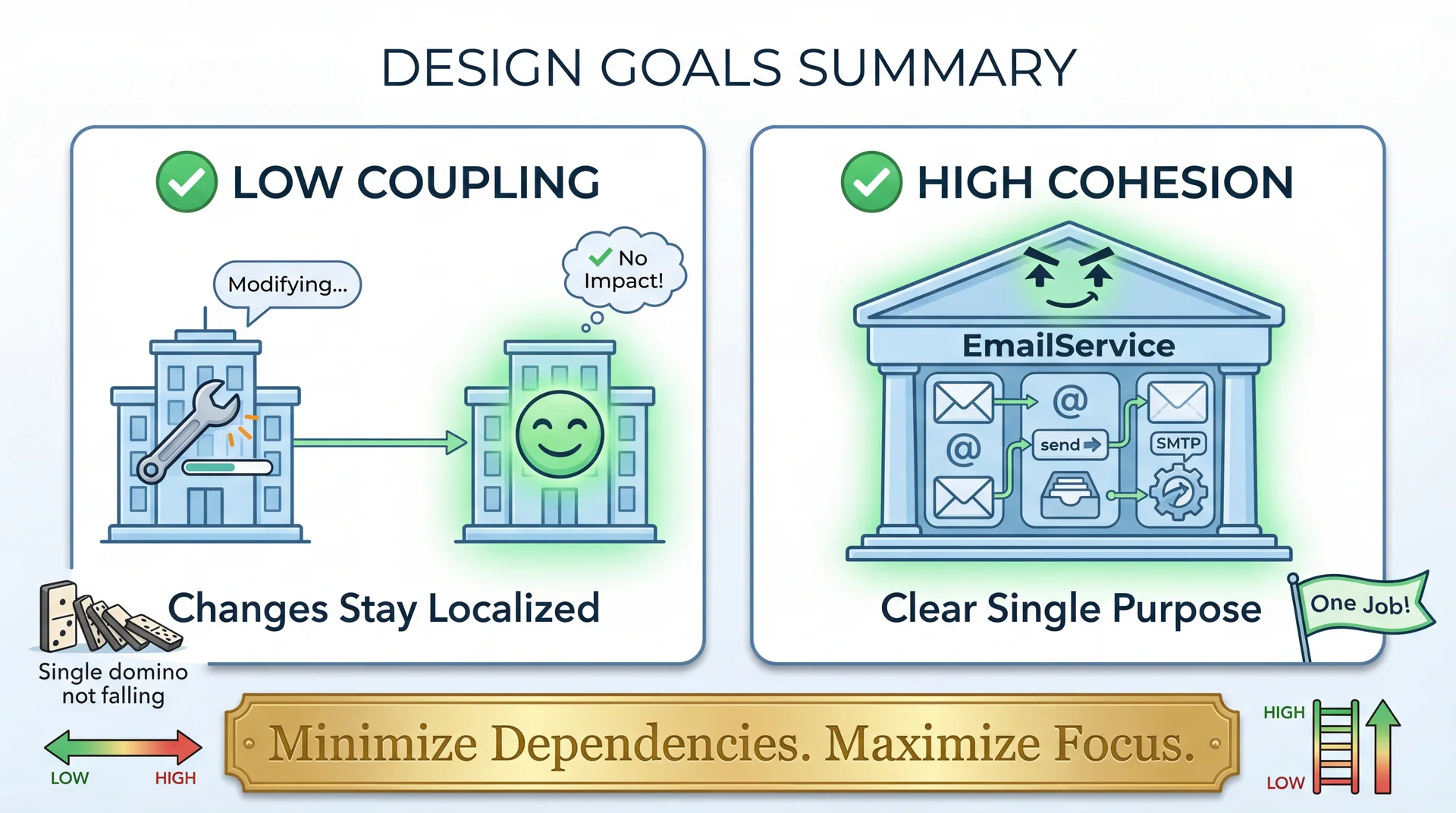 - Low coupling = changes stay localized