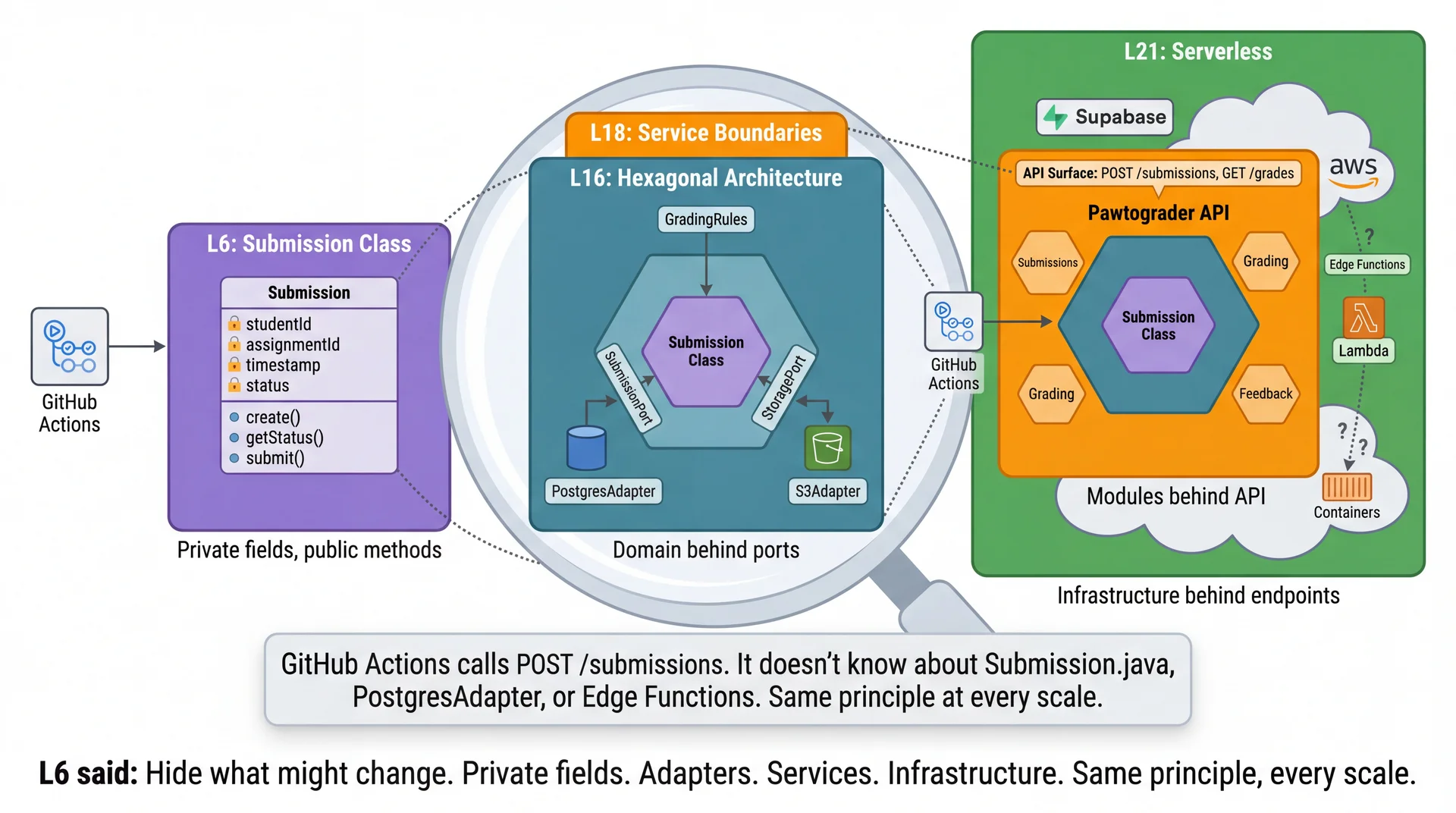 GitHub Actions calls POST /submissions and POST /feedback. It doesn't know — or care — whether these are Edge Functions, Lambda, or a traditional server. That's information hiding at the architectural level.