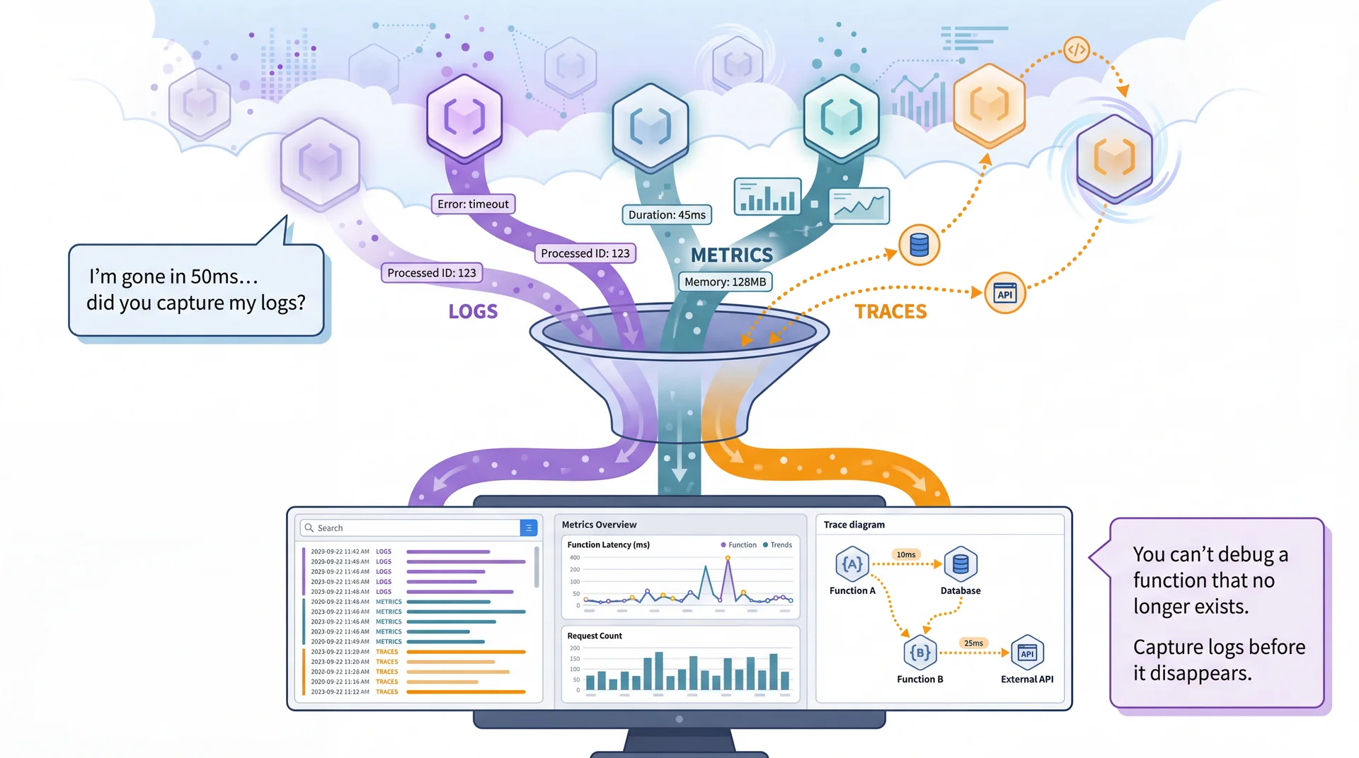 Serverless functions are ephemeral — they spin up, execute, and disappear. You can't SSH in and look around. You must invest in observability, or debugging becomes impossible.