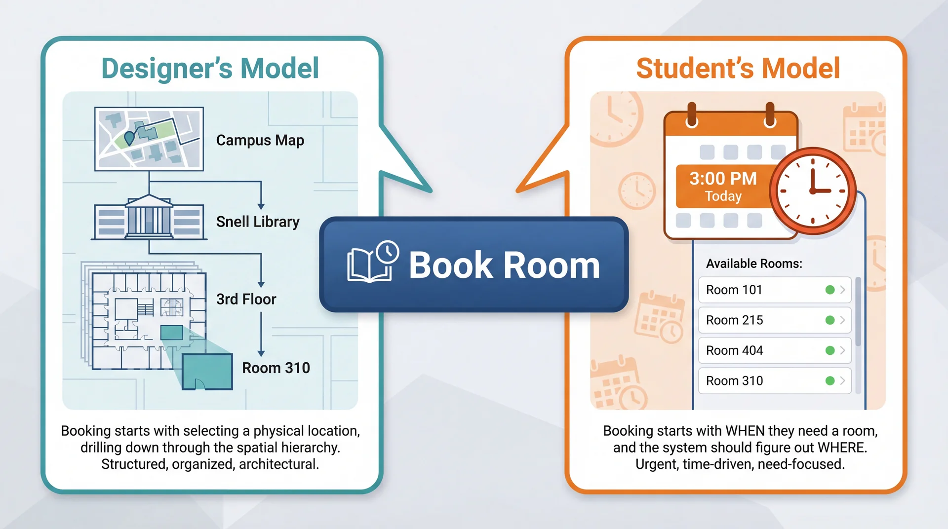 Connection to L24: Remember Marcus and Dorothy? Marcus (power user) might think building-first because he understands system architecture. Dorothy (visiting grandparent) thinks time-first — she just wants a room at 3pm. Same gap: expert vs. casual user mental models.