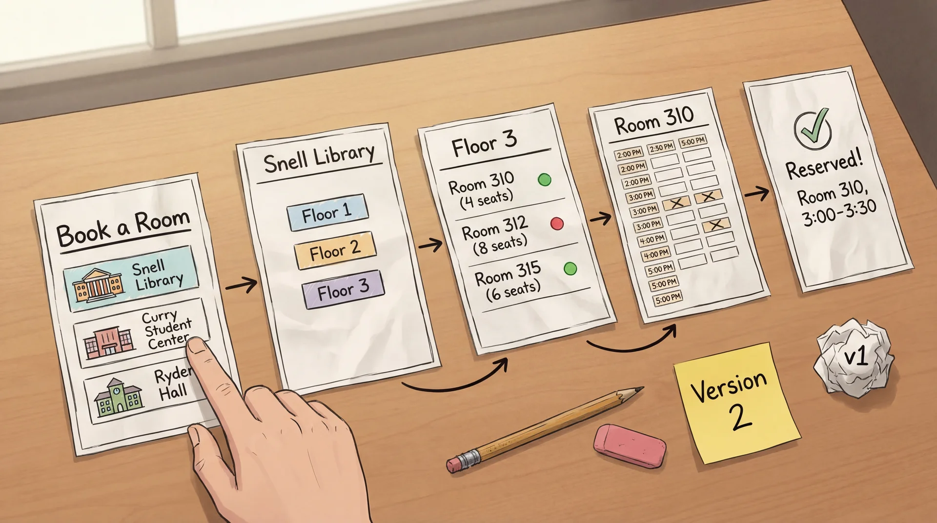 But a student rushing to find a room for their 3pm group meeting doesn't think in terms of buildings and floors — they think "I need a room at 3pm, show me what's available"