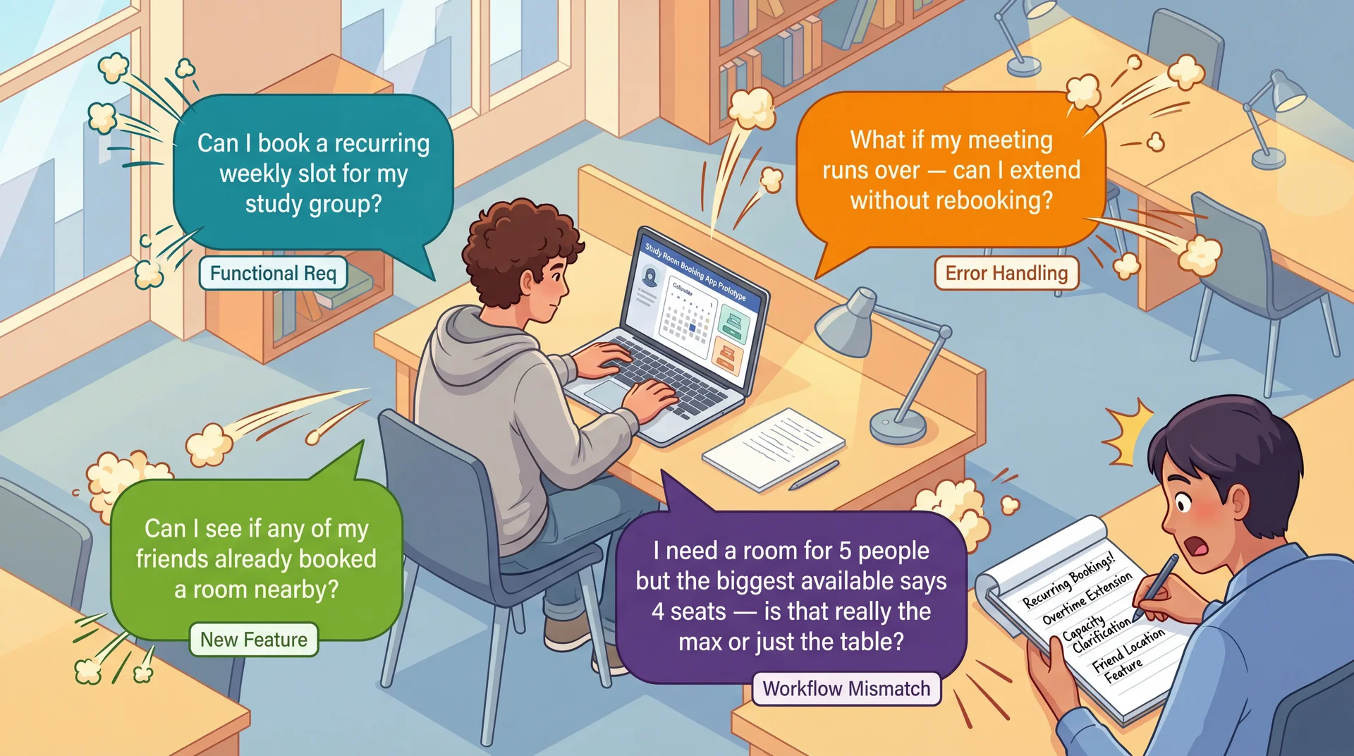 Document findings as requirements — every observation has a source (what the user said/did), a requirement (what the system needs), and a type (functional, conceptual, labeling, workflow)
