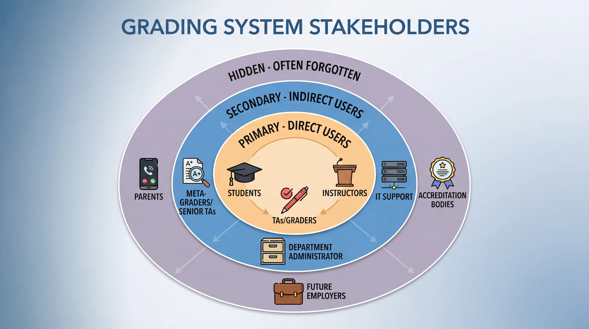 | Graders (TAs) | "Can I grade fairly without losing my weekend?" | Efficiency, accuracy, workload balance | Overwhelming workload, hostile regrades |